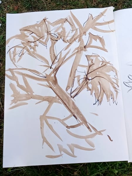 Mitten in der Kasseler Karlsaue holten wir unsere Zeichenbretter, großformatigen Papiere und eine Fülle an kreativen Werkzeugen hervor – Kohle, Tusche, Rohrfedern, Stahlfedern und Japanpinsel – und widmeten uns dem Zeichnen im Grünen. Auch Änne Meyer tauchte tief in die faszinierenden Prozesse des Zeichnens ein und ließ sich von der einzigartigen Stimmung des Parks verzaubern.