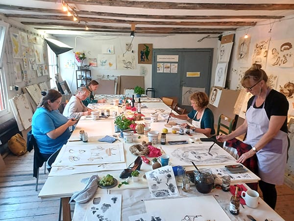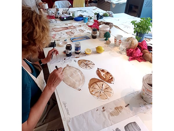 Ein weiterer Höhepunkt des Workshops war die herzliche Gastfreundschaft von Bettina Wachter. Mit ihren köstlichen Speisen schuf sie eine Atmosphäre, die es uns ermöglichte, uns voll und ganz auf unsere künstlerische Arbeit zu konzentrieren. Und mehr noch, sie lud uns zum Essen sogar in ihr schönes Zuhause ein, umgeben von ihren wunderbaren Zeichnungen und Malereien an den Wänden. So wurde ihr Heim nicht nur zu einem Ort des kulinarischen Genusses, sondern auch zu einer Quelle der kreativen Inspiration!